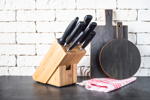 מגוון סכיני שף בגדלים שונים בתוך מעמד לסכינים